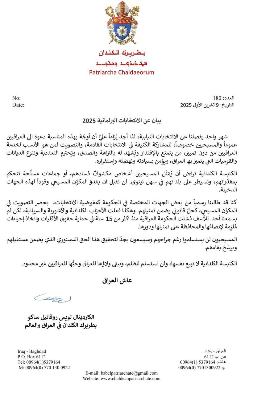 بطريرك الكلدان في العراق والعالم يدعو العراقيين المشاركة في ...