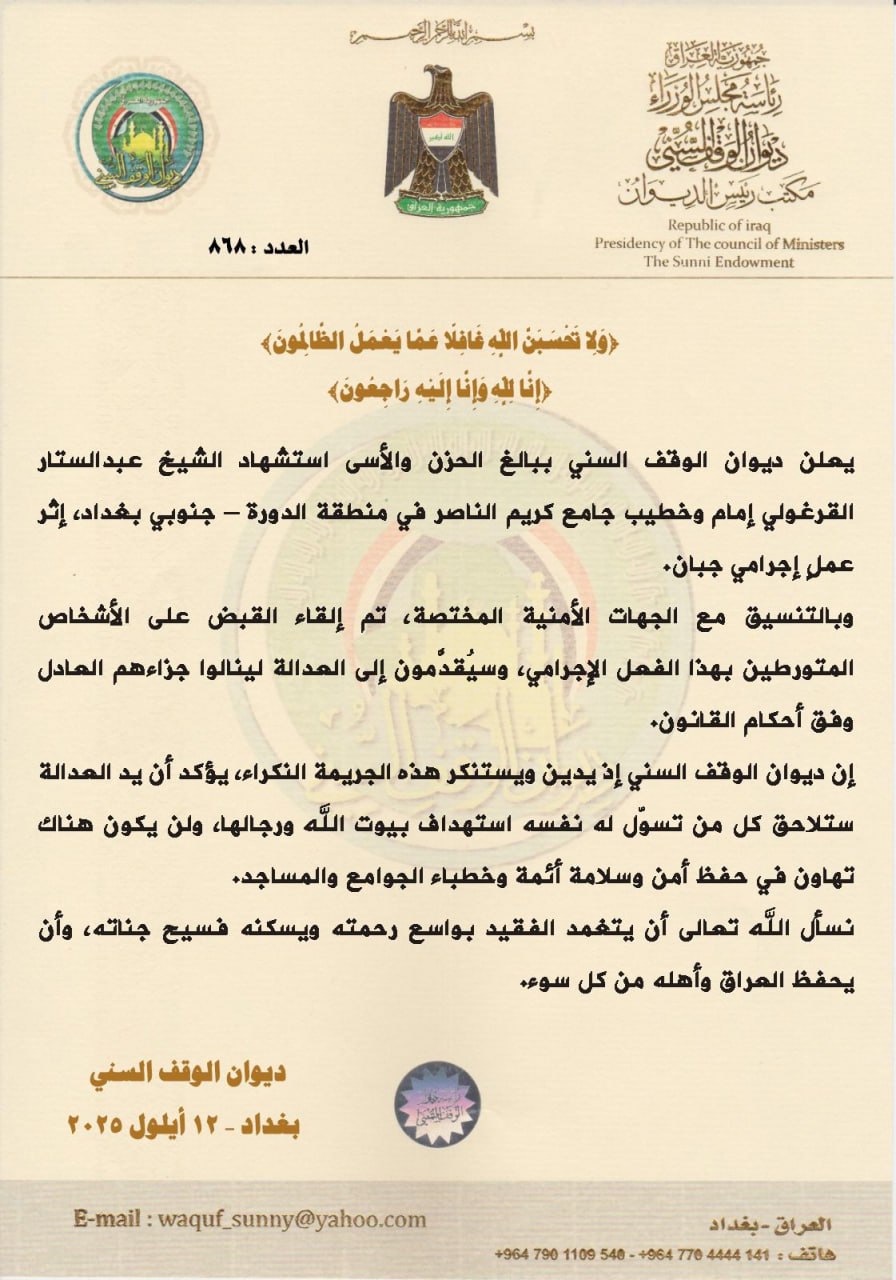 ديوان الوقف السني يعلن القبض على المتورطين بقتل الشيخ عبد ال ...