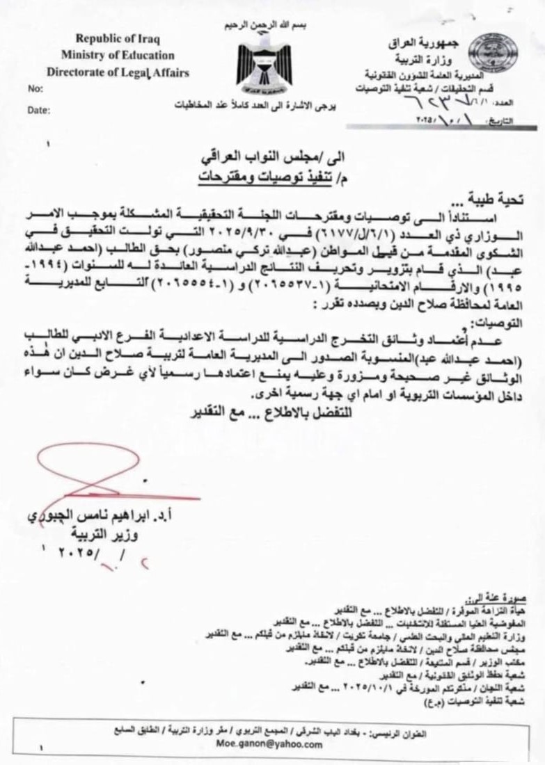 وجهت وزارة التربية، كتاباً إلى مجلس النوّاب يطالب بعدم اعتماد الشهادة الإعدادية لرئيس حزب الجماهير أحمد عبد الله الجبوري (أبو مازن)، ويؤكد أنها مزورة وغير صحيحة ولا يمكن اعتمادها.